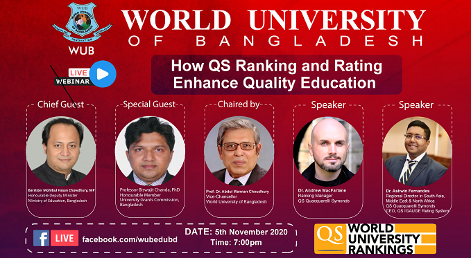 The QS (Quacquarelli Symonds) is one of the leading world university ranking organizations which recognizes the global top universities based on academic excellence. The mission of QS ranking is to enable motivated people around the world to fulfil their potential through educational achievement, international mobility, and career development. For the last couple of years many public and private universities of Bangladesh have been participating in the QS World University Ranking to introducing the quality education system of Bangladesh. In this regard, the World University of Bangladesh is organizing a live webinar session on "How QS Ranking and Rating Enhance Quality Education" on 5th November 2020 at 7 pm. The purpose of this event is to share the knowledge of QS ranking and rating methods with all academia of the universities to improve the quality education.