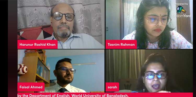 Mr. Harunur Rashid Khan, faculty of English, BRAC University and Ms. Tasnim Rahman, faculty of English, BGMEA University of Fashion and Technology were present as guest speakers. Mr. Faisal Ahmed and Ms. Sarah Tabassum, faculties of English, WUB was the host speaker and moderator respectively.