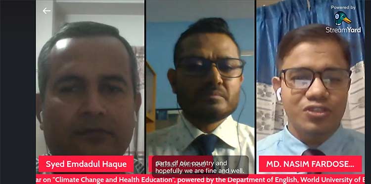 The Department of English, World University of Bangladesh organized a live webinar on "Climate Change and Health Education". It was aired live on the official Facebook page of World University of Bangladesh and the department's Facebook page at 7:00 pm on 20-10-2022 (Thursday).
